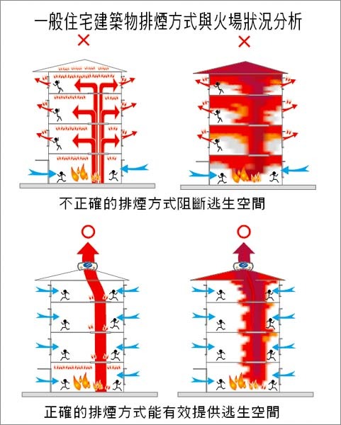 火災現場濃煙的流向: 一般來說火災發生時,濃煙會因熱浮效應及煙囪效應經由樓梯間往上堆積,但如果濃煙無法順利從建物頂層排出,樓梯間就會大量堆積濃煙,進而阻斷樓梯口對外逃生的路徑。 這時對外窗口成了火場唯一的逃生路徑,而當濃煙向上排出受阻時,會向下堆積,經由各樓層對外窗口排,,進而造成往對外窗口逃生之避難人員之重大傷亡。 所以一般火災發生時所造成之人員傷亡現場,都發生在樓梯間及對外窗口處!